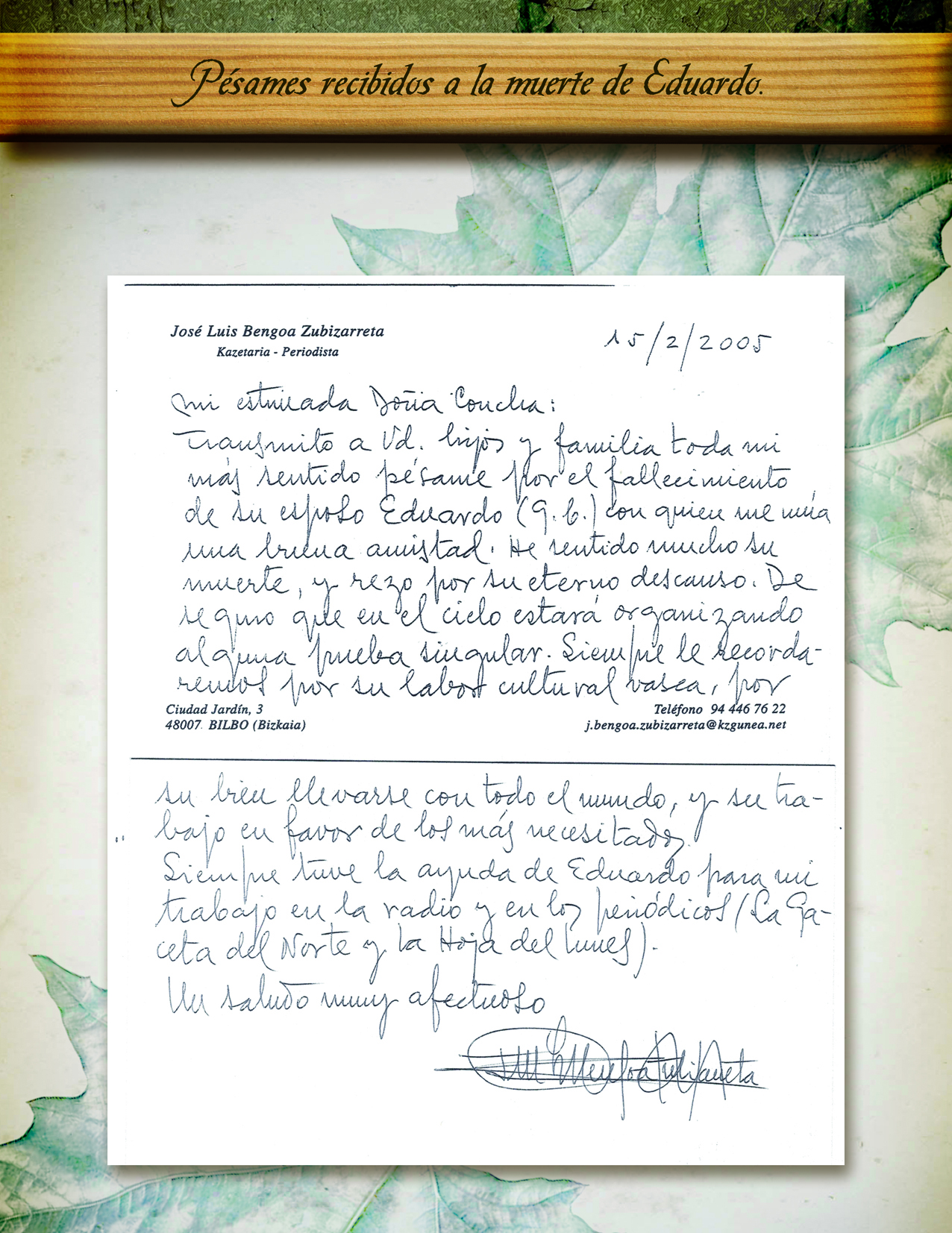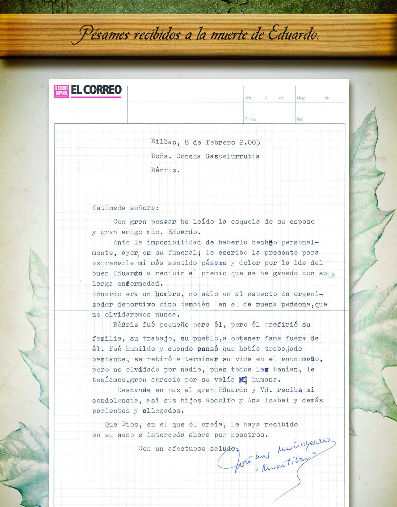 Su mujer, hijos y familiares recibieron numerosas muestras de condolencia por el fallecimiento de Eduardo. Afirmar que en esos momentos de dolor, toda muestra de solidaridad ayuda a soportarlo un poco mejor, si cabe.