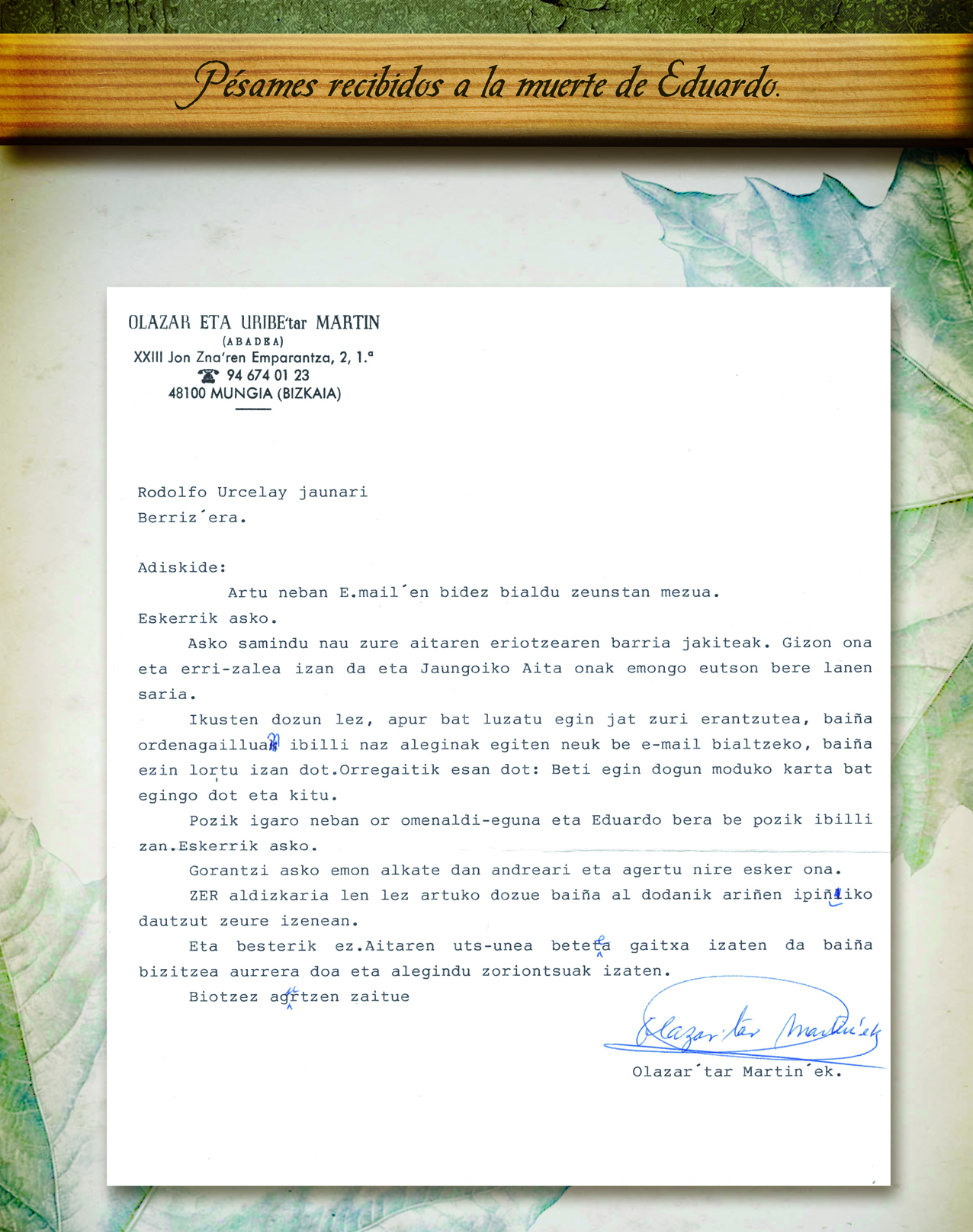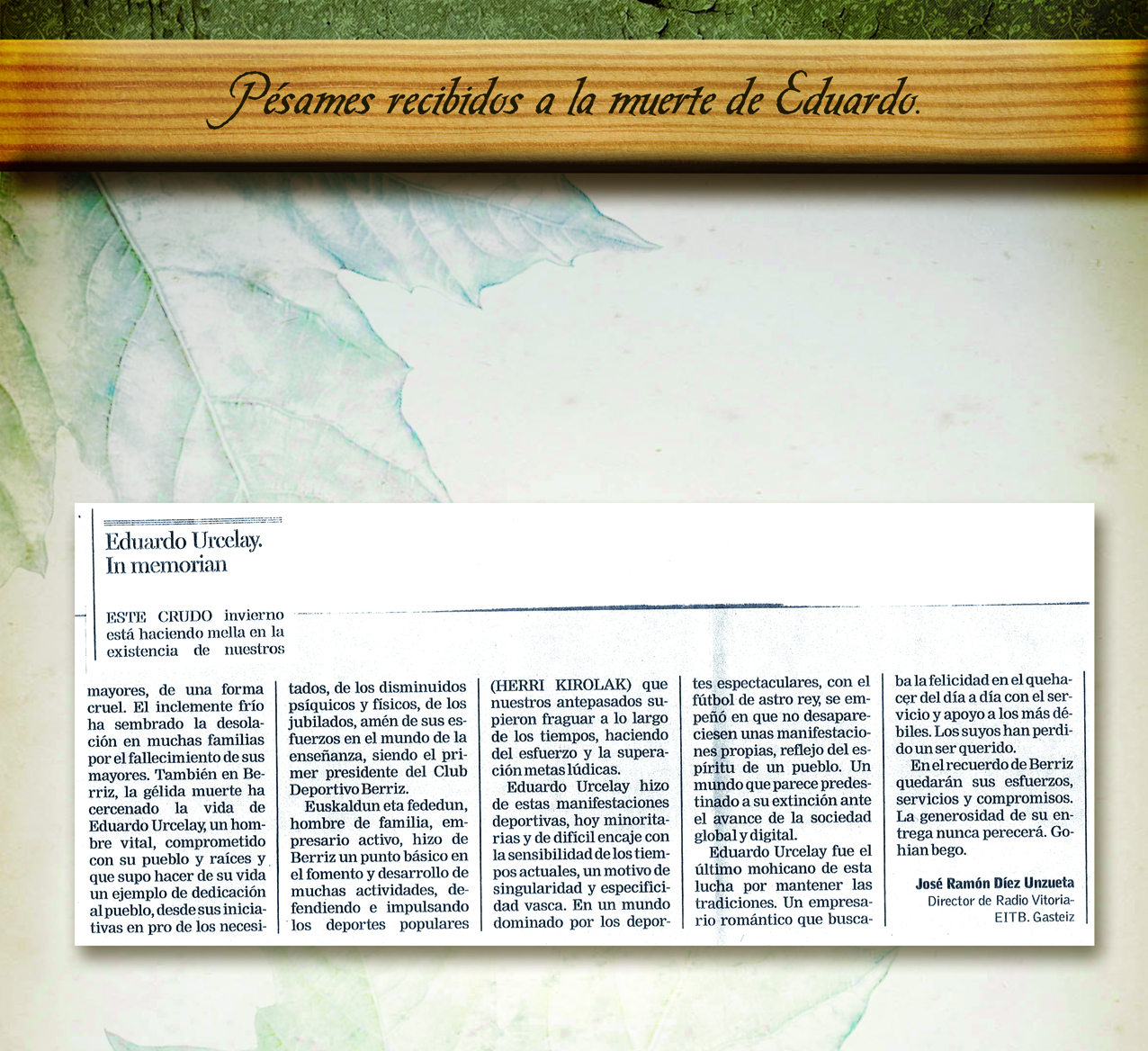 “En todos los pueblos suelen surgir en momentos difíciles hombres que saben comprender la situación y acompañar en la necesidad. Desde la guerra del 36 nuestro pueblo estaba en uno de esos momentos en que todo era persecución, prohibición y opresión. Durante esos años difíciles, por suerte, surgió en Berriz un hombre que supo alegrarlo y darle ánimos, fue Eduardo Urzelai. Solo ó acompañado supo ofrecer diversiones y festejos relacionados con el deporte y el folklore vasco, supo fomentar la cultura, los avances sociales de su pueblo, la ayuda a los necesitados y el buen humor. Todo ello de las más diversas maneras, algunas de ellas muy ingeniosas”